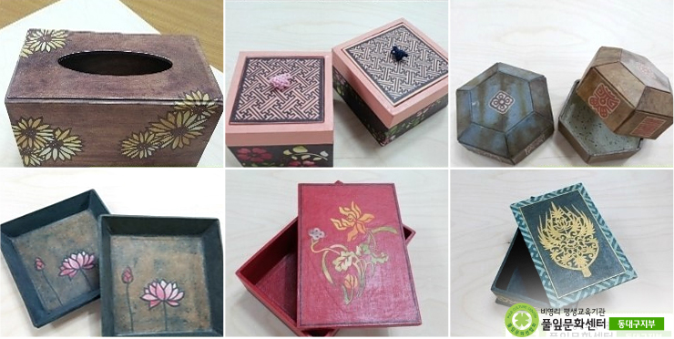ÇÕÁö·Î ¸¸µç ƲÀ̳ª ¿Àµ¿³ª¹«·Î ¸¸µç Ʋ À§¿¡ ´Ú³ª¹«·Î ¸¸µé¾î »ö»öÀÌ ¹°À» µéÀÎ ÇÑÁö¸¦ ºÙÀÌ°í ´Ù½Ã ±× À§¿¡ ¿©·¯ °¡Áö ¸ð¾çÀÇ ¹®¾çµéÀ» ¿À·Á ºÙ¿© »ýȰ¿ëǰÀ» ¸¸µå´Â ¿ì¸®³ª¶ó °íÀ¯ÀÇ ÀüÅë °ø¿¹ÀÌ´Ù.